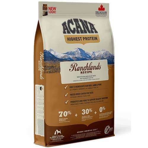 ACANA Ranchlands çiftlikte yetiştirilmiş sığır eti, Yorkshire domuz eti, otla beslenmiş kuzu, çiftlikte yetiştirilmiş bizon ve vahşi yakalanmış balıklarla doludur. Tabiat Ana’nın köpeğinize vahşi doğada sağlayacağı diyeti yansıtarak, köpeğinizin mutlu, sağlıklı ve güçlü kalması için ihtiyaç duyduğu her şeyi alması için et, organlar, kıkırdak ve kemik dahil tüm hayvansal malzemeleri kullanıyoruz.