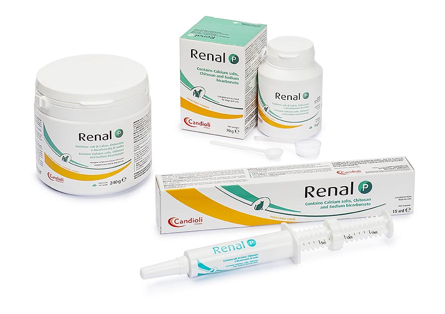 Renal P ve Renal P macunu, normal metabolik koşulların korunmasına ve fosfat ile kalsiyumun bağırsak emiliminin ve böbrek yoluyla atılımının uygun dengesinin sağlanmasına yardımcı olan mineraller (kalsiyum tuzları ve sodyum bikarbonat) ve polisakkaritler (kitosan) içerir. Köpekler ve kediler için tamamlayıcı yemdir.